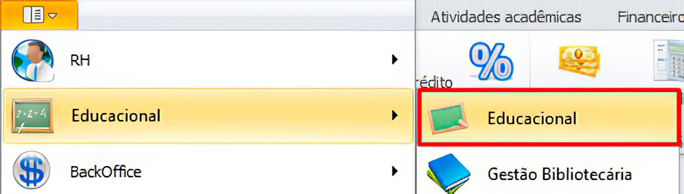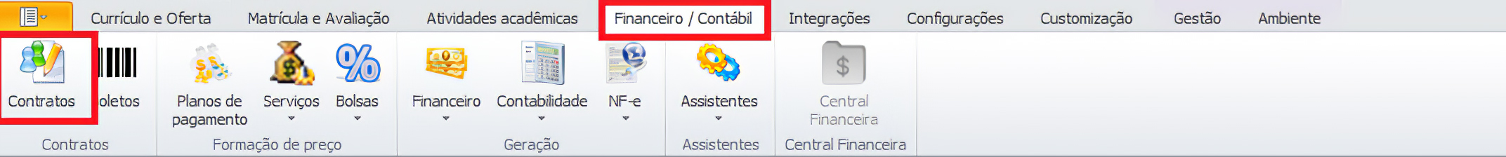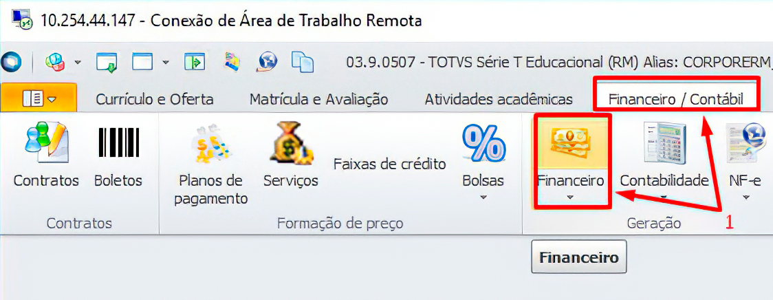 Siga os passos anteriores até chegar a esta tela (Acesse o módulo Educacional -> Clique em Financeiro/Contábil -> Selecione Financeiro); a geração de parcelas para o tipo de serviço mensalidade é realizada mensalmente conforme calendário financeiro a ser divulgado.