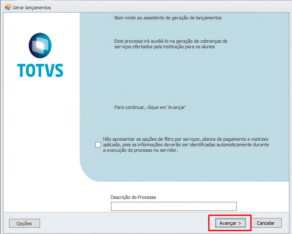 1. Clique em Avançar para dar continuidade ao processo de geração.