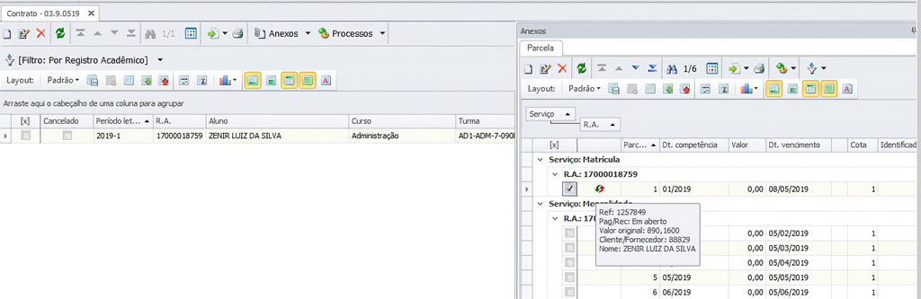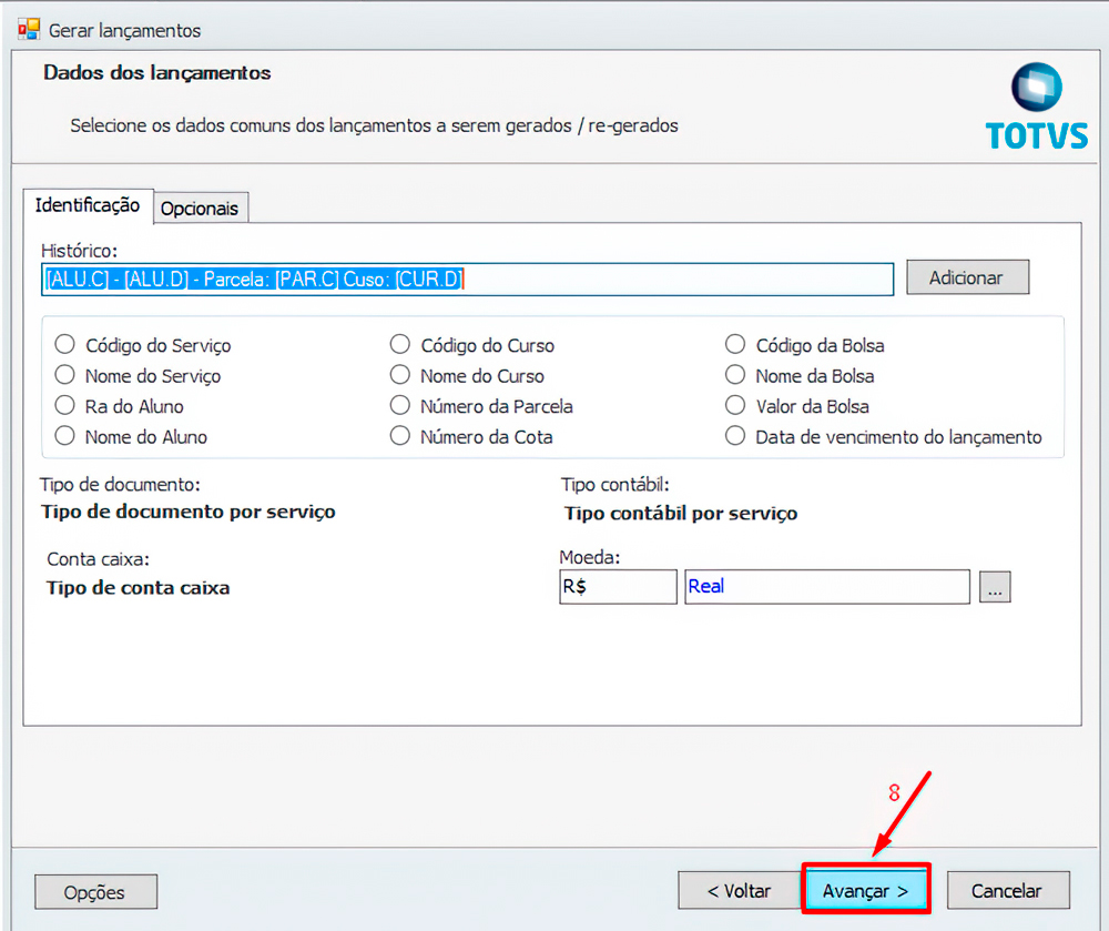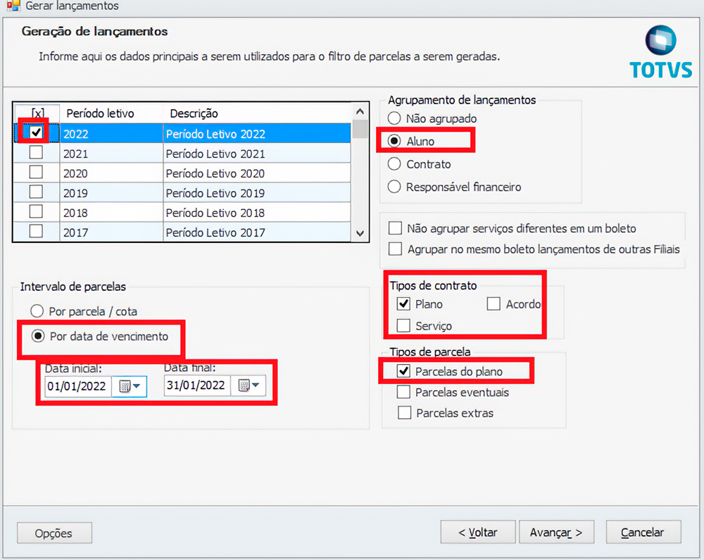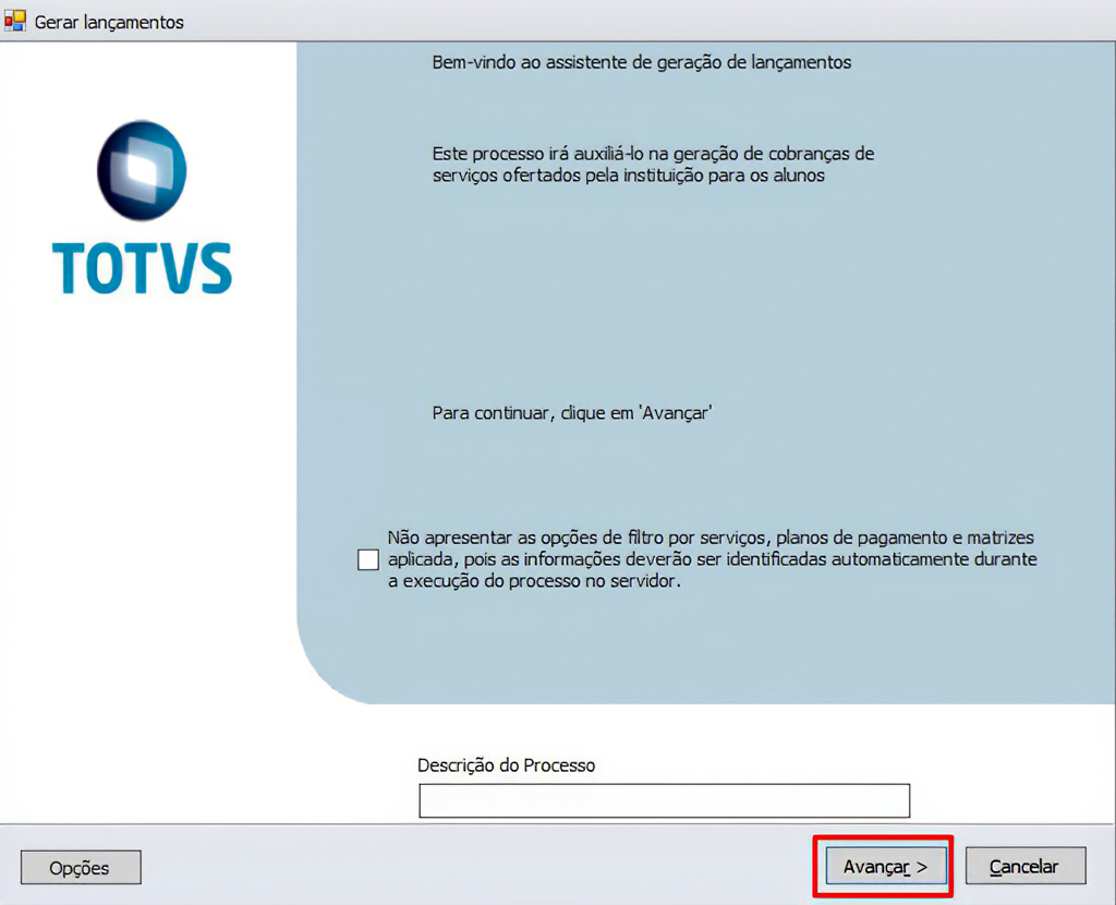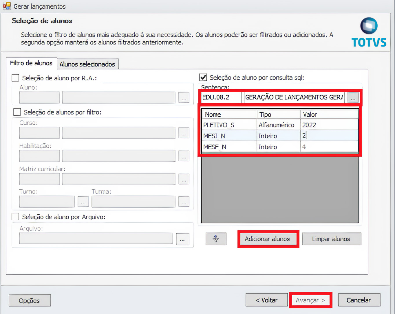 Executaremos o processo de geração de lançamentos em lote por meio de consulta SQL para o serviço de Mensalidade.
