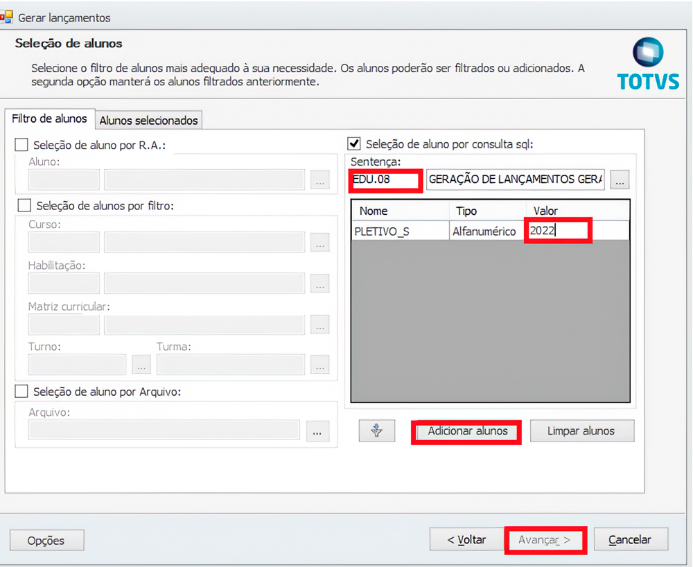 11. Clique em Adicionar alunos para que sejam selecionados os alunos que terão o lançamento gerado.