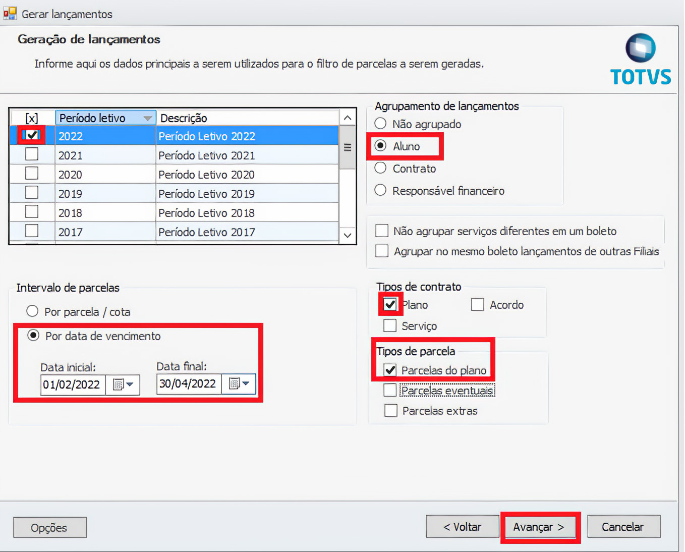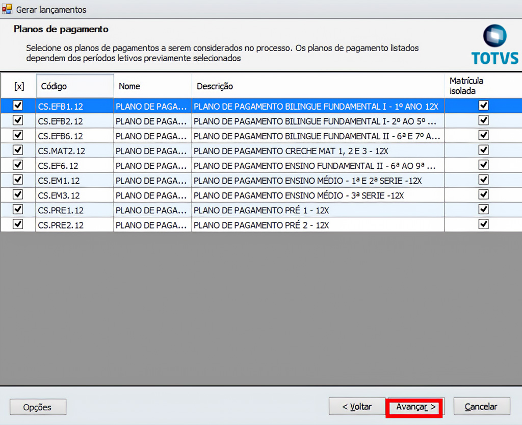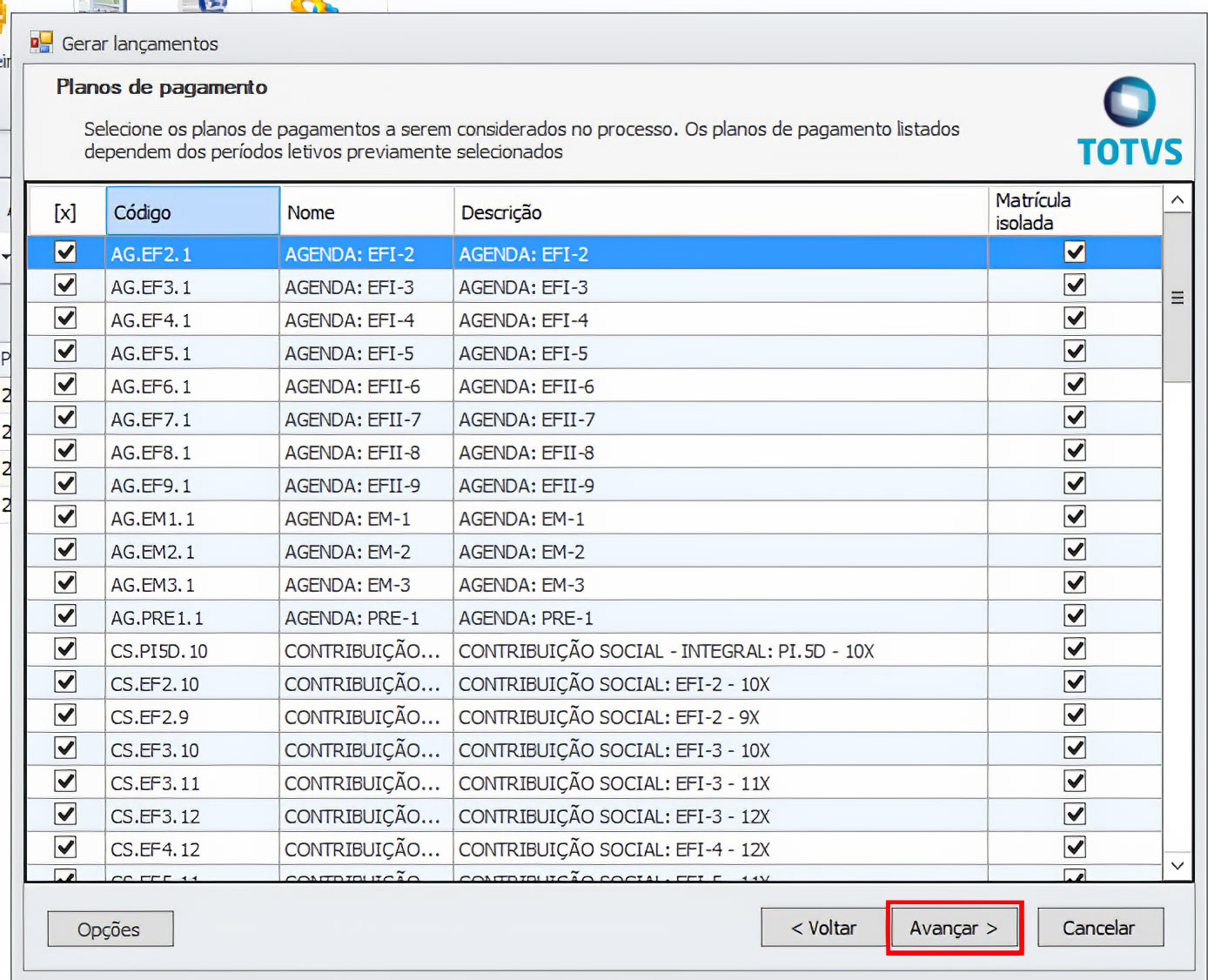 15. Clique em Avançar, pois os planos de pagamento vinculados nesta tela já estão selecionados.