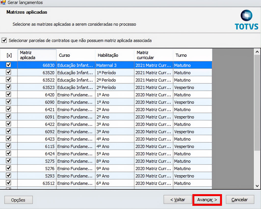 16. Clique em Avançar, pois as habilitações vinculadas nesta tela já estarão selecionadas.