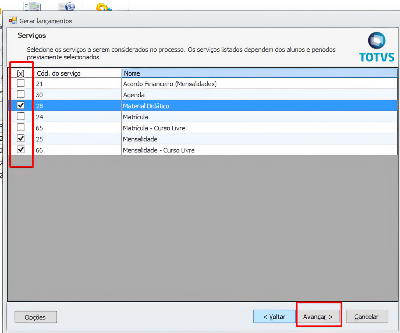 16. Selecione os serviços de Mensalidade, Mensalidade Curso Livre (caso a oferta exista na unidade), Material Didático para que eles sejam agrupados em um único boleto de matrícula.
