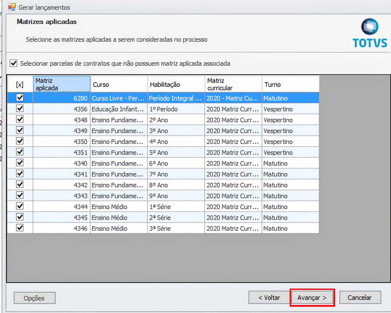 19. Clique em Avançar, pois as habilitações vinculadas nesta tela já estarão selecionadas.