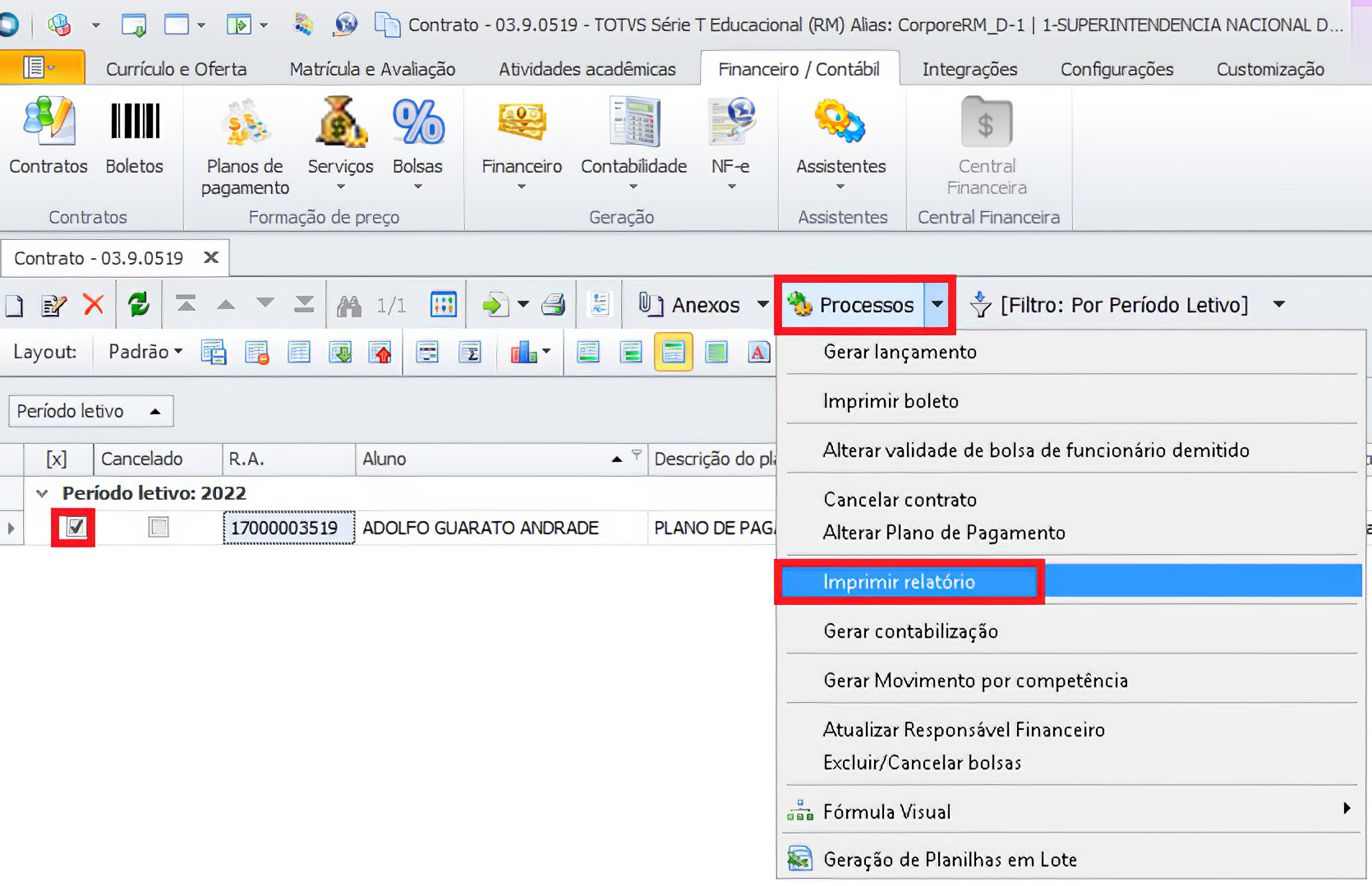 3. Selecione o contrato do aluno, clique em Processos: Imprimir relatório.