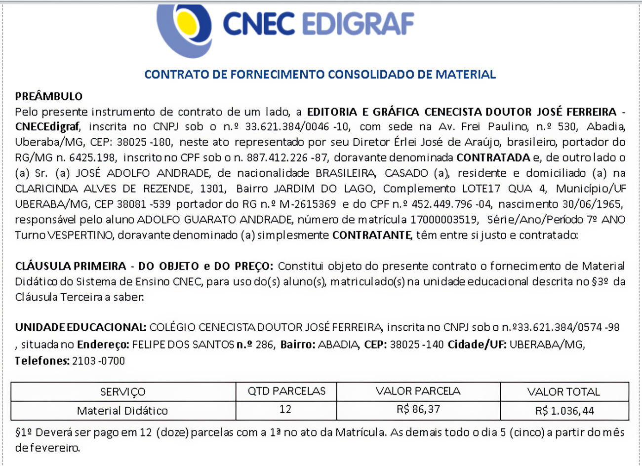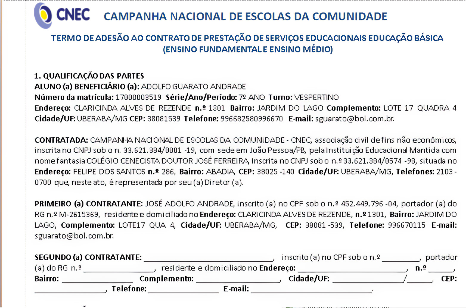 O termo de adesão será gerado de forma agrupada, ou seja, serão emitidos tanto o Termo de Adesão de Prestação de Serviços quanto o Contrato do Material Didático.